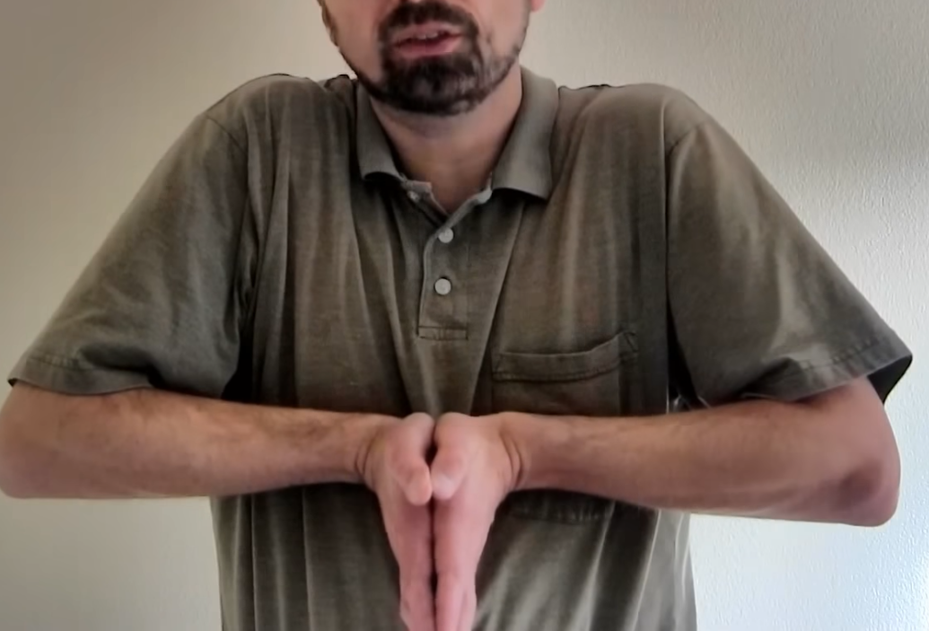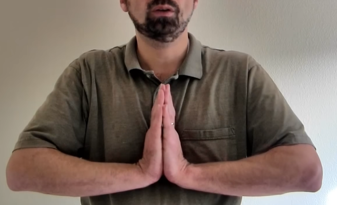 - Hands together near the chest facing upwards, stretching downwards, keep shoulders relaxed
