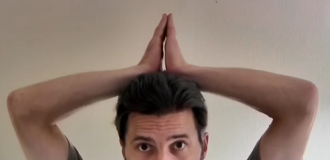 - Same hand position as #6 but move hands overhead, keep shoulders relaxed and pointing outwards